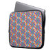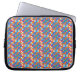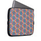 Colorful laptop sleeve with a vibrant geometric floral pattern in red, blue, yellow, and white on a dark background. Modern, playful design.