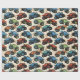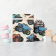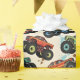 This dynamic monster truck pattern boys' wrapping paper features a repeating design of colorful red, blue, and teal monster trucks catching air, with realistic mud splatters. It is perfect for young racing fans and truck enthusiasts.