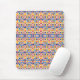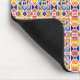 Colorful mouse pad with intricate geometric tile pattern in red, blue, and yellow, featuring a rounded rectangular shape. A white mouse lies beside it.
