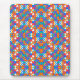 Colorful mousepad with geometric pattern in blue, orange, red, and white. The design is vibrant and symmetrical, featuring abstract shapes and lines.