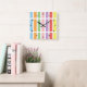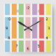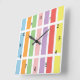 Geometric linear, rectangle, striped pattern of rainbow pastel hues of blue, orange, green, pink, purple, red and yellow.