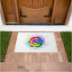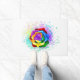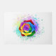 Large, blooming rose with rainbow petals on white background, painted over with splashes of colorful, bright paint. 3d