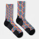 Colorful socks with a jigsaw puzzle pattern in blue, red, yellow, and orange. Black heels and toes contrast vibrantly. Playful and bright design.