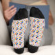 Colorful socks with a repeating geometric pattern featuring small red, blue, and yellow shapes. Black accents are on the toes and cuffs.