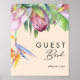 This colorful tropical floral | peach guest book sign is perfect for your modern boho destination green, purple, peach wedding. Design features an elegant bouquet of classic beach watercolor greenery and flowers, including sage green eucalyptus, mauve and red protea, blush pink hibiscus, orange and blue bird of paradise, and dark green palm leaf. The design is ideal for a simple, creative, unique travel wedding for spring, summer, fall, or winter! Please find other matching or coordinating wedding stationery in the rest of the collection.