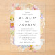 Share your wedding details with fresh, garden-inspired elegance using this colorful watercolor wildflower acrylic wedding invitation. A border of hand-painted blooms in shades of pink, blush, blue, yellow, and warm orange surrounds the design, accented with delicate greenery and botanical details on a clear acrylic background. The couple’s first names are displayed prominently in refined serif lettering, with ceremony details arranged below in a clean, timeless layout. Perfect for spring and summer weddings, garden ceremonies, and outdoor weddings, this acrylic invitation offers a romantic and vibrant presentation that sets a joyful tone for your wedding day.
