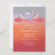 A stunning transition of colour from red to lavender creates the background for a ribbon on which flowers and a yellow bird rest. The words "baby shower" can be deleted making this a versatile invitation.