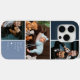 Sleek photo collage phone case features three of your favourite photos in a gridded layout with contrasting blue squares. Personalize with your custom message in white lettering. Give the ultimate stocking stuffer with a new photo phone case.