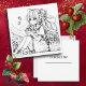Cute anime girl eating strawberries on a summer day colouring card. Simple and easy colouring page for children.