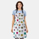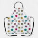This apron has a mid-century modern design of scattered mazes, some with coloured blobs under them.