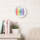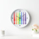 This modern round, clock, with a wooden border, has a simple and elegant design of paintbrushes in rainbow colours (red, orange, yellow, green, blue, indigo and violet), with just four numbers; 12, 3, 6 and 9. The numbers are black and the clockface is white. It would look good in a craft room, on an art room wall, or in a modern setting.