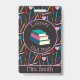 A library hall pass badge with a stack of 3 colourful books and a doodle illustration of coloured pencils in the background . Looks into our collection for the entire hall pass series . Look into our shop for different designs .