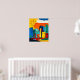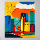 A vibrant and playful painting of a cityscape, featuring a bright yellow sun radiating against an orange sky. The scene includes tall, colourful buildings, a prominent red bridge, lush green hills, and a serene body of water in the foreground. Bold colours and simple shapes add a modern touch to this artwork, making it perfect for brightening any room or personalizing products. Ideal for art lovers who appreciate urban charm combined with abstract and contemporary design