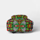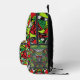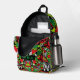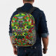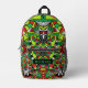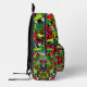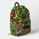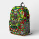 This all-over printed backpack is a true standout, boasting a vibrant and intricate pattern of geometric shapes and figures. The symmetrical design, featuring shades of green, red, white and black, is reminiscent of a kaleidoscope, turning everyday scenes into complex, mesmerizing patterns. The central figure, subtly resembling a face, adds a touch of mystery and intrigue. But what truly sets this backpack apart is its customizable feature - the text printed in bold green letters at the bottom. This personal touch makes the backpack uniquely yours, reflecting your identity and style.