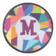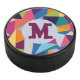 This hockey puck features an abstract bold and colourful design of geometric shapes. Customize your design by easily adding an initial, featured in magenta font (can be changed to any colour of your choice).