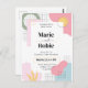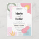 The design features a vibrant and colourful abstract background, which makes a statement and sets the tone for a lively and joyful celebration. Perfect for couples looking to add a touch of fun and modernity to their wedding festivities. The text is in clean and elegant fonts, which contrasts well with the playful background, making the invitation easy to read while still being visually appealing.