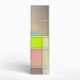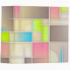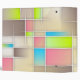 An abstract illustration with large and small squares and rectangles with intersecting lines. This creative design has contrasting pastels and brights in the colours of cream, rose pink, lime green, light brown and bright blue.