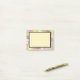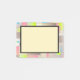 The background on these sticky notes is an abstract illustration with large and small squares and rectangles with intersecting lines. This creative design has contrasting pastels and brights in the colours of cream, rose pink, lime green, light brown and bright blue. On top there is a cream coloured rectangle with a black border where you can write all your notes.