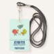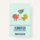 Name tag with a trio of cute and whimsical hand-drawn birds. 2 of the birds are standing together with some tiny green pine trees in between their feet. Another blue bird is flying up in the air between them.