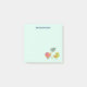 Personalized post-it notes with a trio of cute and whimsical hand-drawn birds. 2 of the birds are standing together with some tiny green pine trees in between their feet. Another blue bird is flying up in the air between them. Mint green background.