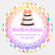 © 2021 Socialite Designs. Elegant cake bakery sticker design incorporating a festive and colourful diamond pattern background, multi-colour scalloped border banner for your text, and a custom cake with swirls and floral design elements.