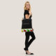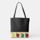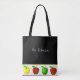 Fun teacher's tote bag done in black, with a white band, along the bottom, with yellow, green, and red apples. White text is ready to personalize for yourself or for your favourite teacher.