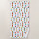 This beach towel has a mid-century modern design of arrows made from black lines and different shapes in retro colours of red, blue, green, orange, gold, and grey on a field of white. Want the same design with different colours? Message me.