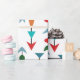 This wrapping paper has a mid-century modern design of arrows made from black lines and different shapes in retro colours of red, blue, green, orange, gold, and grey on a field of white. Want the same design with different colours? Message me.