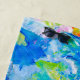 Image of a colourful painting palette, a number of brushes and a palette knife. Blue and green colours prevail. Beautiful vibrant one-of-a-kind beach or bath towel for anyone.