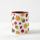 This coffee mug features a colourful autumn harvest pattern with pumpkins, cranberries, acorns, and chestnuts on a white background. Great gift for fall and Thanksgiving!