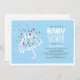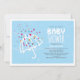 Customize this lovely stylish Baby Shower invitation. Lovely modern clean design with a white line art umbrella under colourful shower on a blue background. Quick and easy customization, change all the template information with your own.