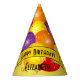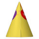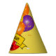 Colourful balloons with confetti are centred on this conical paper party hat with template text as part of the design over a yellow background. Fill in the template fields with your celebration and name, remove the name or click customize to select a typeface style, colour, and size you like.