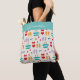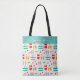 Colourful and modern beach holiday icon pattern on personalised holiday tote bag.