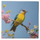 A vibrant bird sits on a blooming branch amidst a bright-coloured floral scene with butterflies fluttering around, creating a vivid and cheerful natural ambiance perfect for spring imagery.