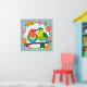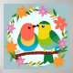 Two brightly coloured birds sit on a branch encircled by blooming flowers, symbolizing love, nature, and springtime happiness. The playful artwork showcases vibrant colours and cheerful emotions.