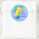 A bright, fun balloon bouquet flies through the air tied together with a blue shining star and red ribbon. Personalize these colourful stickers with any name and birthday age. Shown is "Justin's 10th Birthday!" on a light blue background. Easily change all the text and even change the colour as well as the blue background. Just click on "Customize it" and then click on "edit" and then "background" to change the colour.