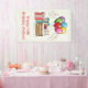 Destei's fun original birthday theme illustration featuring colourful birthday balloons together with two present boxes and a birthday cake. The brown and cream colour cake has several layers on it and the top is decorated with four colourful candles, two strawberries and some blueberries. The gift boxes are wrapped with beautiful bows and there is some confetti on the sides of the design. The colour scheme includes colours such as red, pink, blue, yellow, purple, teal, and beige. There is also a personalizable text area.