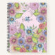This is a customizable notebook that exudes a sense of personal style and artistic flair. The cover is adorned with an intricate floral print, a vibrant symphony of blossoming flowers in hues of pink, purple, and blue, intertwined with lush green leaves. Each flower is meticulously detailed, showcasing petals that seem to bloom right off the page, creating a stunning botanical garden on the cover. The background colour of the notebook's cover is a gentle light pink, which complements the colourful floral design and adds a touch of softness to the overall look.