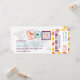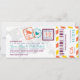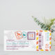A boarding pass inspired ticket invitation with fun passport stamp details and airmail stripes. Shown in shades of Yellow, Orange, Teal, Navy and Plum. Back side includes extra space for any hotel, travel or website information.