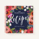 Square spiral recipe notebook printed with a frame of hand-drawn flowers in orange, coral red, hot pink, and white. Add your name in white letters against dark blue. Recipes is written across the floral recipe book in a charming white brush script.