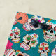 Bright images of sugar skulls make a colourful pattern on this unique personalized beach towel. There are several different skull images, all individual in various colours, and placed on a teal background. At the bottom is a matching teal banner with your custom text in white.