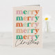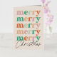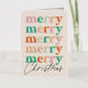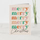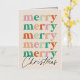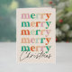 A modern, colourful and bright merry Christmas greeting card featuring the word "merry" written multiple times on top of each other in beautiful holiday colours. The word "Christmas' is written in a modern script.