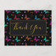 Party thank you postcard designed with an elegant pattern with a graphic illustration of fluttering butterflies in many bright colours, contrasting very nicely on the black background. Whimsical florals, sprigs and leaves add a bit of charm. A black frame with a gold coloured border layered over top with "THank YOu" written inside in a trendy font. Message on the back can be personalized or left as is.