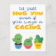 This fun postcard features three colourful cartoon cactus on a white background. The caption, in calligraphy blue and all caps yellow fonts, reads I'd still hug you even if you were a cactus.