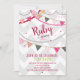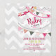 A colourful and adorable birthday invitation for a little girl. Featuring grey and white chevron with pink and red and grey pennants, ribbon, confetti, and stars. It's an adorable way to invite friends to your little girl's birthday!