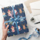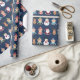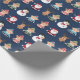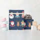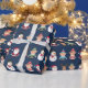 Popular Christmas characters including Santa, elves, snowman and reindeer on navy blue gift wrap