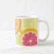A colourful array of citrus fruits, including orange, lime, lemon and grapefruit on a mug.