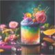The image features a colourful cocktail glass placed in the centre and adorned with multi-colour frosting. The top of the drink is beautifully embellished with ice cream and flower decorations. Additional decorative elements around the glass cup include slices of orange fruit and flower petals. All of these elements are staged on a reflective black surface, emphasizing their vibrant colours against the deep, dark background. The background's tone adds a touch of mystery, partially tinged with a hint of purple, further accentuating the entire composition's artistic and creative atmosphere.