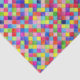 Squares of graph paper coloured in by hand with coloured pencils in random colours. No two adjacent squares have the same exact colour. Graph paper squares outlines are made up of light blue lines.