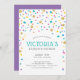 This Colourful Confetti Birthday Party features confetti in bright colours of teal, purple, yellow, blue and pink with faux gold glitter. Solid purple colour on the back of the card. For enquiries about custom design changes by the independent designer please email paula@labellarue.com BEFORE you customize or place an order.